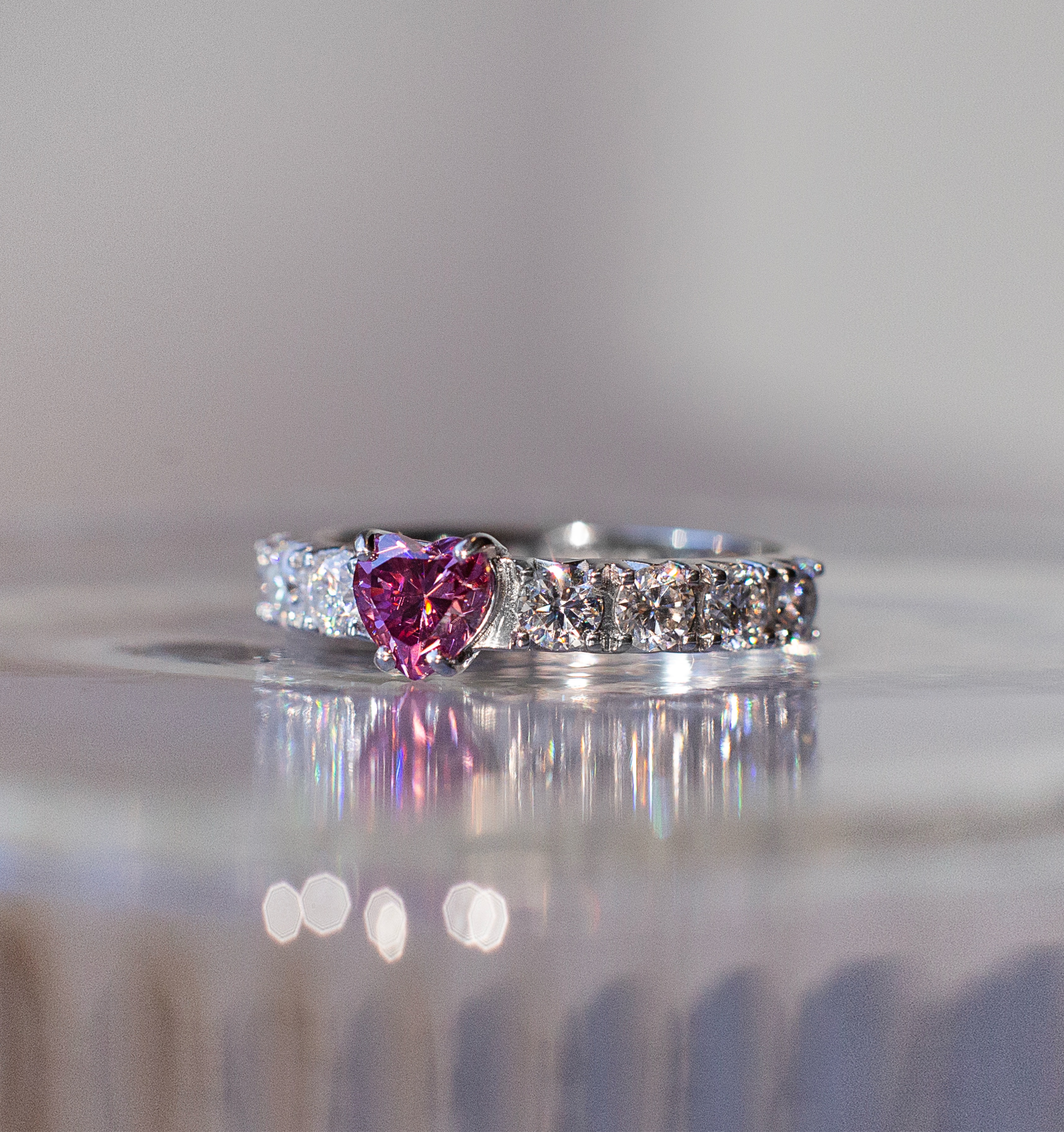В центре — розовый муассанит нежно-малинового оттенка. Рядом — белые муассаниты, ослепительного блеска. Камень исключительного света и силы притяжения. Мы используем выращенные муассаниты с сертификатом качества.